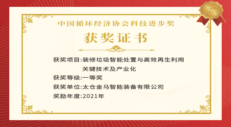 金馬裝備榮獲“中國(guó)循環(huán)經(jīng)濟(jì)協(xié)會(huì)科學(xué)技術(shù)獎(jiǎng)一等獎(jiǎng)”